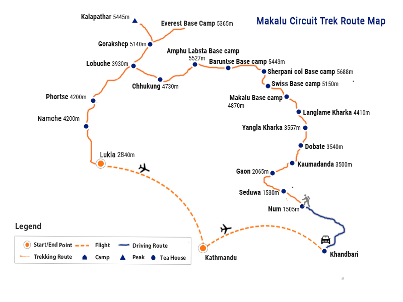 The trek itself starts from a lower altitude and gradually gains elevation over several days of hiking, allowing trekkers to acclimatize to the altitude and avoid altitude sickness. The starting point of the trek is in the town of Num, which is located at an altitude of approximately 1500 meters (4921 feet) above sea level. The highest point on the trek is Makalu Base Camp, which is located at an altitude of 4870 meters (15,978 feet) above sea level. However, it involves several ascents and descents, so the elevation varies throughout the trekking route. This trek is a high-altitude trekking route in Nepal and trekking at such altitudes can be challenging and requires proper acclimatization and physical fitness.